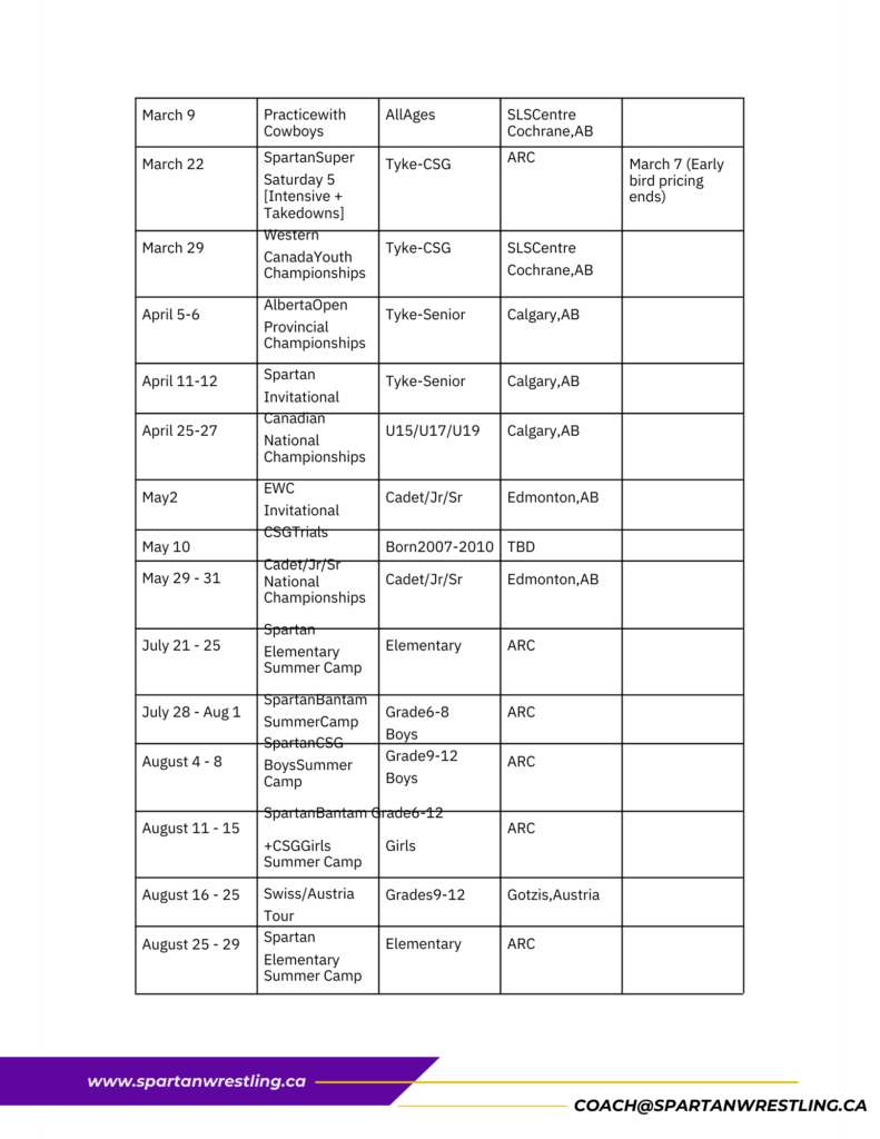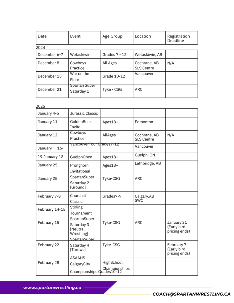 Competition Schedule admin-CF December 6, 2024 0 Comments Calgary Spartan Wrestling Tournament Schedule Attached is the schedule for Calgary Wrestling upcoming events. I will update with deadlines over the holiday break and attach all the google forms. The google forms and calendar are up to date on our social app under “Events”
